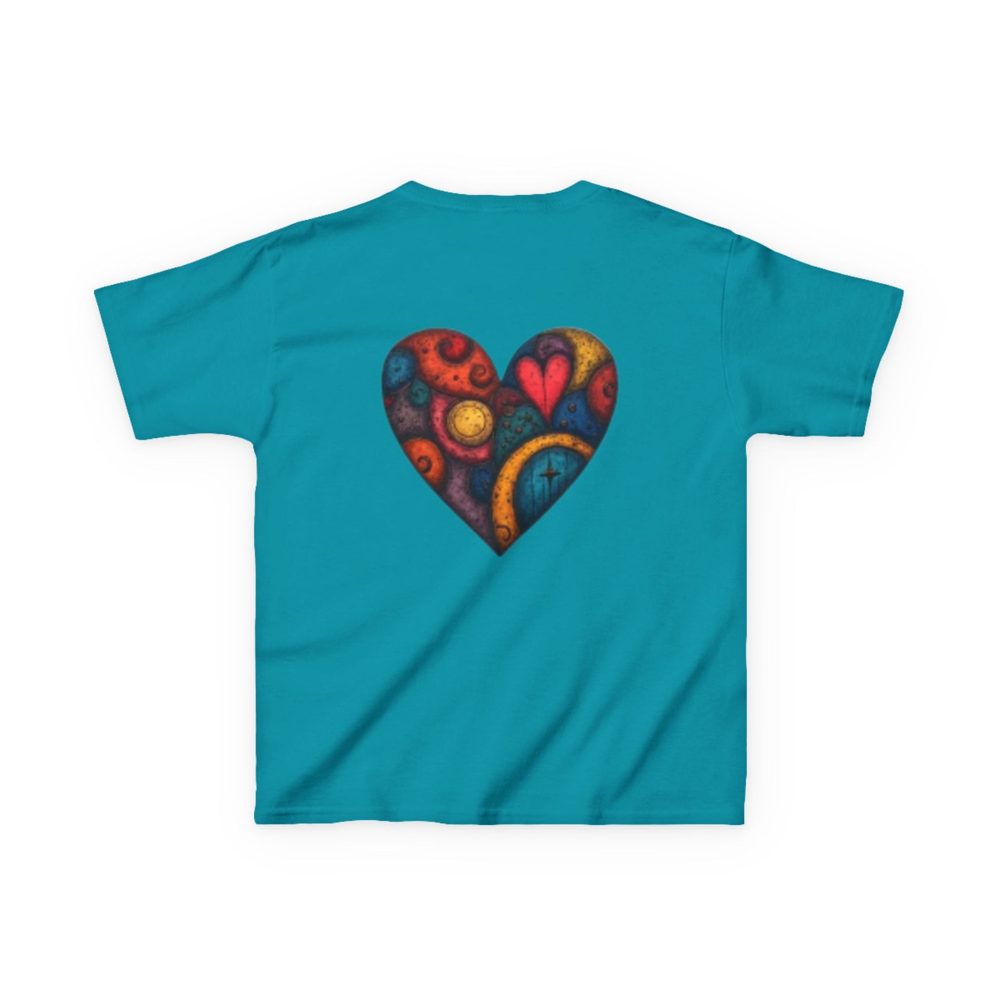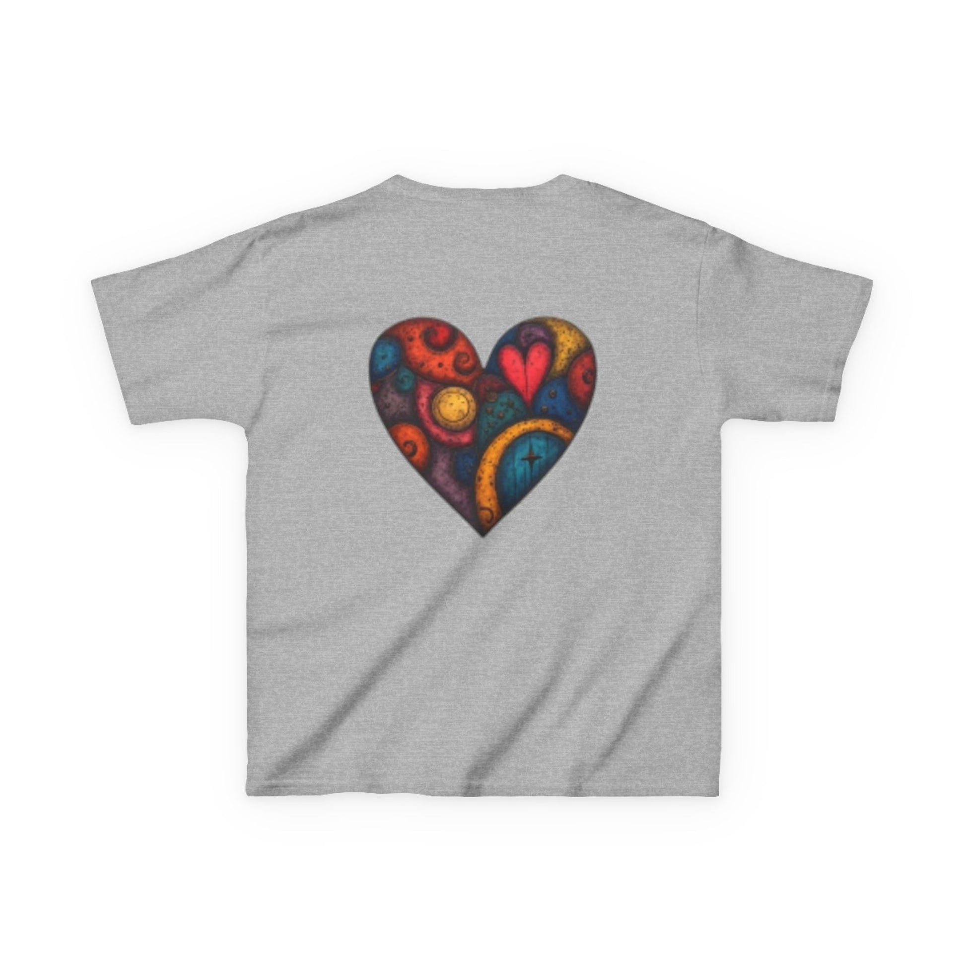 The kids heavy cotton tee is perfect for everyday use. The fabric is 100% cotton for solid colors. Polyester is included for heather-color variants. These fabrics are prime materials for printing. The shoulders have twill tape for improved durability. The collar is curl resistant due to ribbed knitting. There are no seams along the sides.